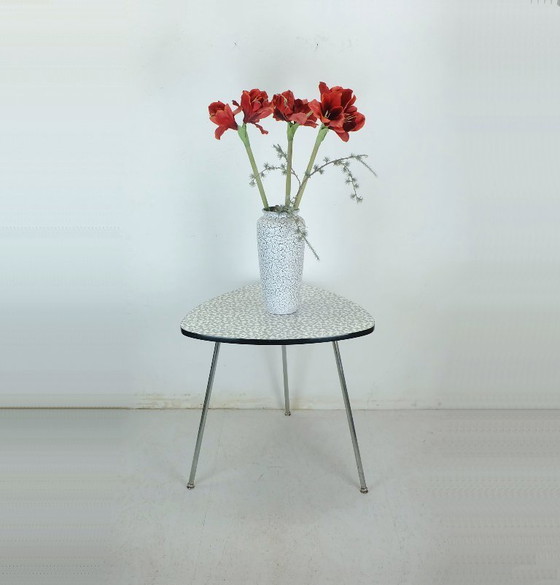 Mesa de centro de tres patas de los años 50 con tablero de formica y patas cromadas inclinadas.