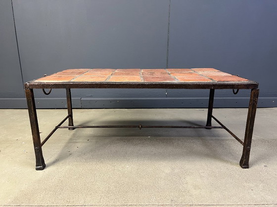 Mesa de centro vintage con base de hierro forjado hecha a mano con anillas y tablero de azulejos de cerámica.
