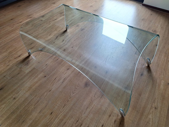 Una mesa de centro o mesa de sofá vintage modernista de cristal en cascada, llamada Genio, diseñada por Massimo Iosa Ghini (Italia) en el siglo XX. Su forma clara y curva en cascada le da una apariencia ligera y flotante. Solo las patas metálicas le dan la sensación de estar apoyada en el suelo. Un hermoso diseño del reconocido diseñador Massimo Iosa Ghini, miembro del vanguardista Memphis Group de Ettore Sottsass y responsable de numerosas instalaciones para cadenas minoristas y hoteles. La mesa de centro está firmada y fabricada en cristal de seguridad de Fiam (Italia). Su diseño limpio y elegante se integra a la perfección en ambientes contemporáneos, tradicionales o modernos de mediados de siglo.