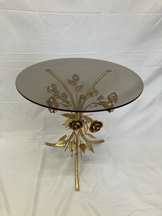 Preciosa mesa de centro florentina de hierro con hoja chapada en oro. Diseñada por el conocido diseñador Hans Kögl en la Alemania de los años 70. La mesa tiene un tamaño fino y un aspecto precioso. En la base hay una placa de cristal ahumado. Esta tiene un rasguño (ver foto) que apenas se puede ver en la foto.