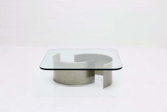 Mesa de centro de diseño francés de la década de 1970. La pieza cuenta con un tablero cuadrado de vidrio de 2 cm de grosor y una base de acero inoxidable. La base puede colocarse en diferentes posiciones.