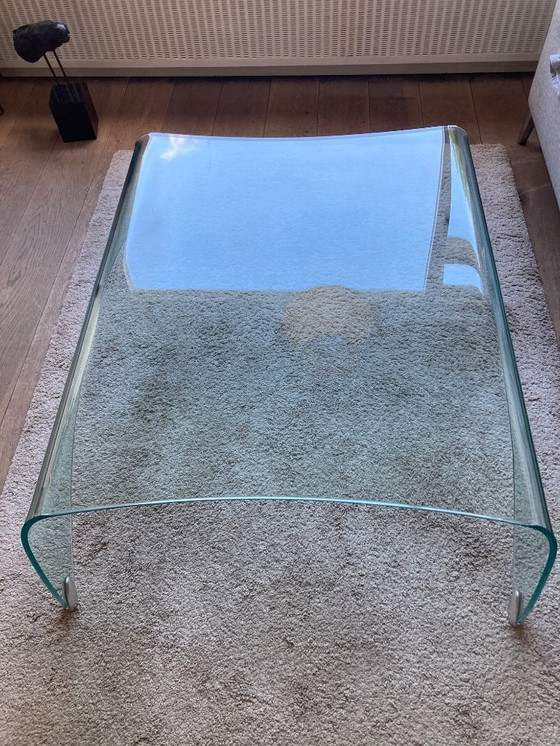 Una pieza de diseño única de la marca líder italiana FIAM: la mesa de centro Genio, diseñada por Massimo Iosa Ghini (conocido por su trabajo con el movimiento Memphis). Esta mesa atrae todas las miradas gracias a su forma fluida de una sola pieza de cristal curvado, combinada con elegantes soportes metálicos.