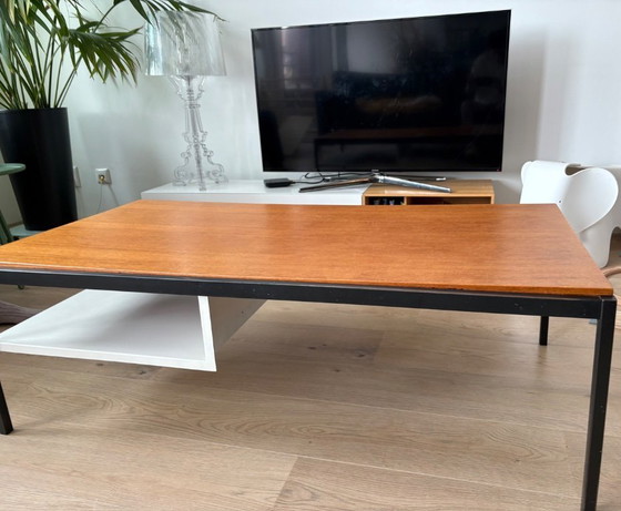 La mesa de centro fue diseñada por Coen de Vries para Gispen en la década de 1960. La mesa tiene un tablero de chapa de teca, un compartimento para revistas de metal blanco debajo y un marco de metal negro.