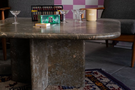 Esta excepcional mesa de centro impresiona por su sólida construcción y la sensación orgánica de la roca de aguas profundas utilizada en su creación. Su superficie texturizada y sus esquinas redondeadas le confieren una presencia arcaica, casi escultural. Ideal como pieza central llamativa en una sala de estar moderna, una oficina elegante o como un elemento decorativo en un salón.