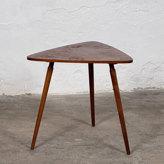 Esta auténtica mesa de centro triangular de los años 60 es un ejemplo clásico del diseño minimalista de mediados de siglo. Con una distintiva superficie triangular de esquinas redondeadas, la pieza se apoya sobre tres patas delgadas y cónicas que le confieren una característica postura de la era atómica.