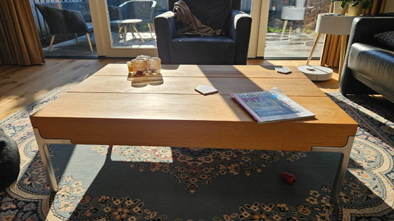 Esta mesa de centro de diseño elegante y robusto 'Beam' de Masimo es un verdadero punto de atracción para su interior. Fabricada en roble macizo y acabada con aceite, la mesa desprende un aire cálido y natural. Las patas de aluminio fundido han sido cuidadosamente lijadas para un acabado refinado. Con unas medidas de 82x120x37 cm, esta mesa encaja perfectamente en cualquier salón. A pesar de los ligeros signos de uso, la mesa ha sido tratada con mucho cuidado y se encuentra en perfecto estado. Ideal para los amantes del diseño moderno.