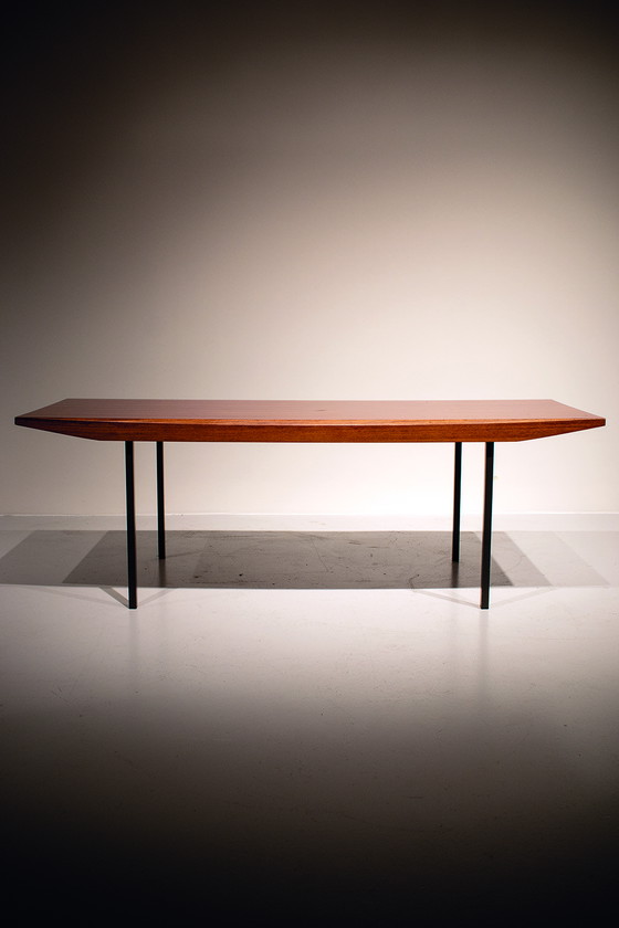 Mesa de centro Wilhelm Renz de la década de 1960. Un diseño sencillo pero elegante de mediados de siglo, elaborada en chapa de teca con patas de metal. El tablero presenta pequeñas abolladuras, pero por lo demás, la mesa se encuentra en buen estado vintage.