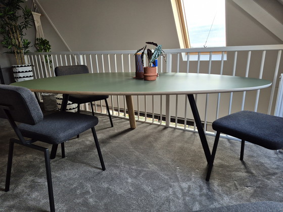 Debido a una mudanza inesperada, la mesa de comedor Circlips de Castelijn apenas se usó. El tablero Circlips 2, de 215 x 124 x 74 cm de ancho y 124 x 74 cm de profundidad, está fabricado en HPL U 19504 SD, color verde calabacín, con borde cónico tratado al aceite blanco mate. Dos patas de mesa en negro mate intenso y una pata de roble macizo tratado al aceite blanco mate.