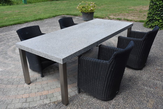 Mesa de comedor robusta de granito de Borek, ideal para exteriores. La mesa cuenta con un tablero de granito resistente que se asienta sobre la estructura de acero inoxidable y es fácil de desmontar. El tablero de granito tiene un acabado rugoso y está en buen estado, con mínimas señales de uso.