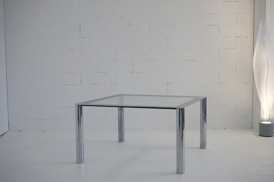 La mesa de comedor Cinova de 1969, diseñada por S. Mazza y G. Gramigna, está hecha de vidrio y metal cromado. Obra de arte italiana. La estructura de la mesa está impecable. El tablero es de vidrio ahumado. La base es de metal cromado.