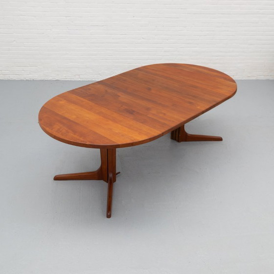 Elegante mesa de comedor danesa extensible de los años 60, fabricada en teca maciza de un color cálido e intenso y con una veta vibrante en el tablero. Su construcción es limpia y equilibrada, con bordes suavemente redondeados y una base de diseño exquisito que le confiere un aspecto sereno y refinado. El tablero muestra un hermoso juego de vetas de teca, creando profundidad y carácter sin resultar caótico. De una forma redonda compacta de 109 cm, la mesa se extiende con dos extensiones hasta convertirse en una amplia mesa ovalada de 209 cm, con capacidad para aproximadamente ocho comensales. La extensión se integra perfectamente con el diseño, manteniendo una armonía fluida en ambas posiciones.
