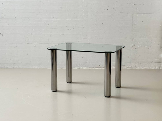Condición: Buen estado vintage con desgaste propio del paso del tiempo. Ligeros arañazos y daños menores en los bordes del tablero de cristal, así como ligeras señales de desgaste en las patas de acero inoxidable. En general, robusto, limpio y totalmente funcional.