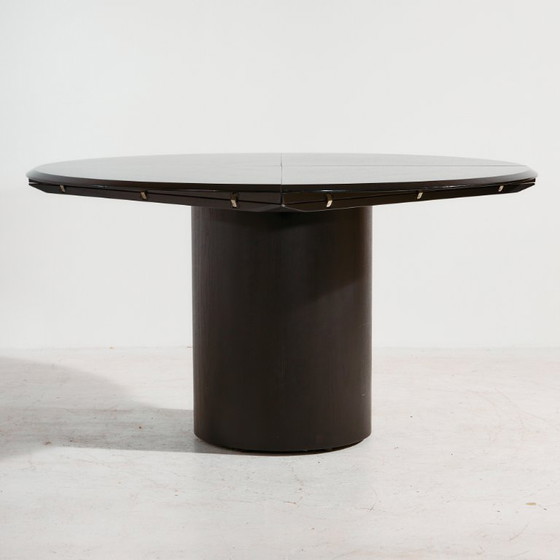 La mesa de comedor «Quadrondo», diseñada por Erwin Nagel para Rosenthal en la década de 1980, presenta una característica interesante: el tablero se puede extender, transformándolo de redondo a cuadrado. La estructura es de roble teñido de negro, y el tablero interior es laminado. Presenta arañazos, manchas y desgaste en algunas zonas.