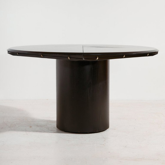 La mesa de comedor «Quadrondo», diseñada por Erwin Nagel para Rosenthal en la década de 1980, presenta una característica interesante: el tablero se puede extender, transformándolo de redondo a cuadrado. La estructura es de roble teñido de negro, y el tablero interior es laminado. Presenta arañazos, manchas y desgaste en algunas zonas.