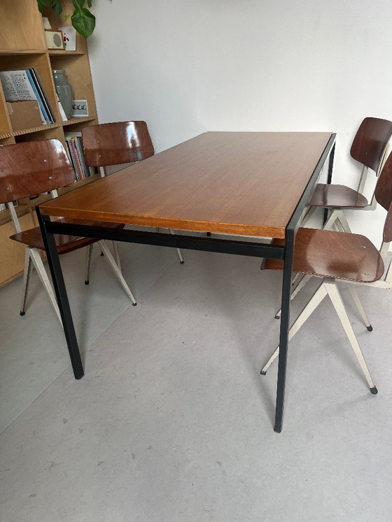 Mesa de comedor vintage de la serie japonesa de Pastoe, diseñada por Cees Braakman. Un diseño elegante y discreto con una esbelta estructura de metal negro y una cálida tapa de madera con vetas finas.