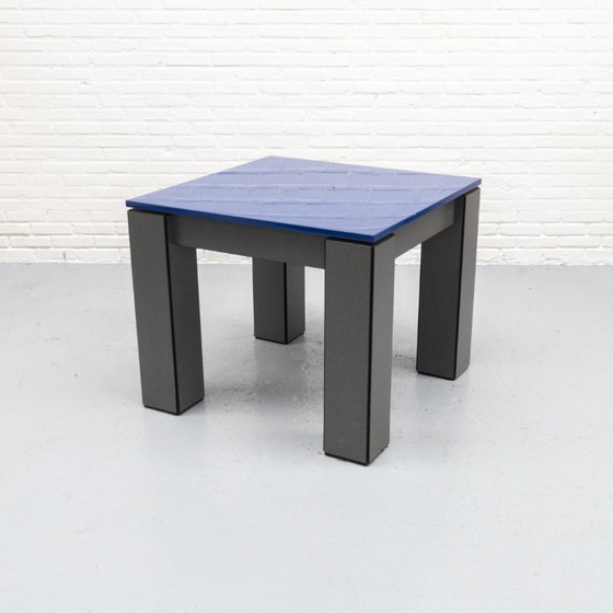 Llamativa mesa de comedor alemana de los años 80 con un diseño claramente posmoderno. La sólida mesa tiene un tablero de madera lacada en azul intenso de alto brillo que contrasta elegantemente con las pesadas patas de color grafito con acentos geométricos. Su carácter minimalista, casi arquitectónico, recuerda las influencias de Memphis Milano.