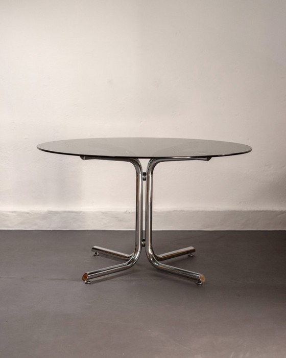 Mesa de comedor redonda italiana de acero cromado tubular y cristal ahumado, 1960