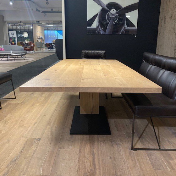 Mesa de comedor rústica KFF Asco Mono - 240x100. La mesa de comedor rústica ASCO Mono presenta un diseño asimétrico único. Su tablero está cuidadosamente cortado de madera maciza, dejando a la vista características naturales como los anillos de crecimiento y las grietas por secado. Esto le confiere carácter y autenticidad. La robusta estructura, tallada en un tronco de árbol sólido, descansa sobre una base rectangular de acero con recubrimiento en polvo o acero crudo aceitado con marcas de producción visibles. La Mono es una pieza que destaca por su belleza y realza el carácter natural de la madera. Esta mesa es la elección perfecta para quienes aprecian el diseño auténtico con un toque contemporáneo. Dimensiones: 240x100x75 cm (alto). Patas de duramen asimétricas. Base: negra. Tablero de roble macizo aceitado blanco. Grosor del tablero: 4 cm.