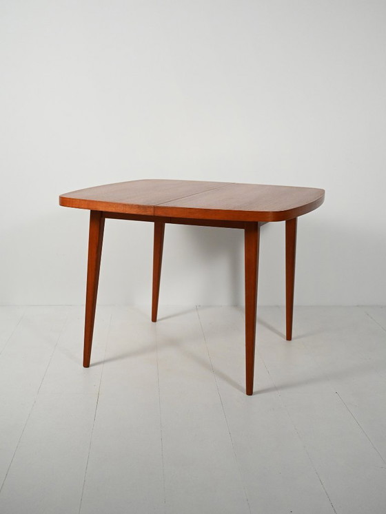Mesa de comedor escandinava de teca de los años 60 con tablero semicuadrado de suaves curvas, patas cónicas y líneas limpias. Original AB Möbelfabriken Linden, marca del fabricante Horda.
