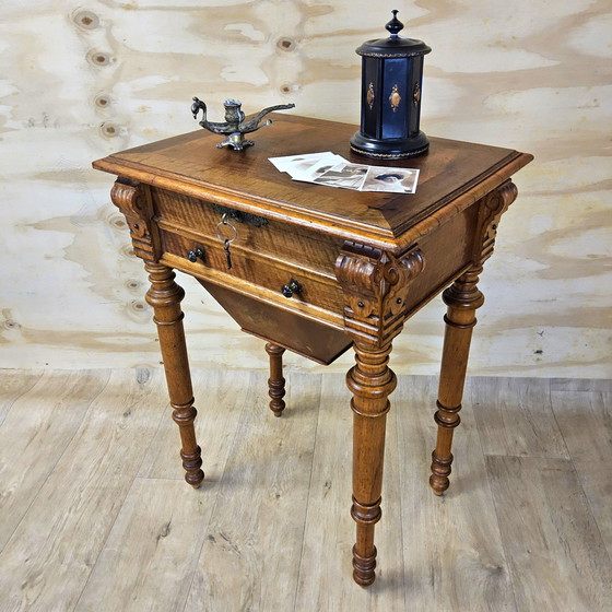 Una hermosa mesa de costura antigua de estilo Biedermeier. La mesa de costura está construida en madera con varios tipos de chapa. Nogal en el exterior y hermosa madera de raíz con su cálido color y su alegre veteado en el interior. Esto se aprecia al abrir la solapa superior, revelando un cajón con un compartimento adicional para el hilo de coser. El compartimento aún contiene varias bobinas originales. La solapa y el cajón se cierran con llave. Al desbloquearlo, el cajón se puede abrir tanto desde la parte frontal como desde la superior. El cajón inferior siempre está abierto y ofrece espacio de almacenamiento adicional. El compartimento inferior se desliza hacia adelante, donde antiguamente se tiraban hilos sueltos y pequeños trozos de tela para reutilizarlos. Un periódico de 1955 aún se conserva en el cajón inferior. En resumen, un hermoso mueble para el aficionado.