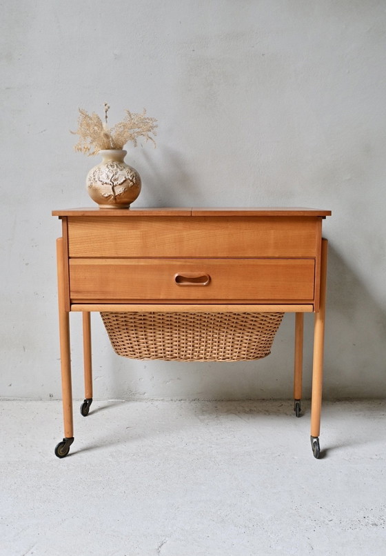 Mesa de costura de diseño danés de la década de 1960, fabricada en teca. Una preciosa pieza con ruedas, con un cajón con compartimentos para artículos de mercería y una cesta extraíble de mimbre o ratán debajo para lana o tela, por ejemplo.