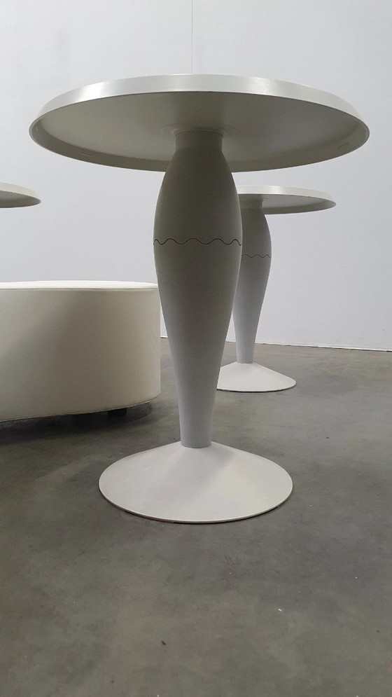 Mesas redondas y compactas, en gris claro, ¡para interior y exterior! Miss Balù Philippe Starck para Kartell Italia, 1990. Una mesa redonda muy compacta, en gris claro, con una sola pata, inspirada en el estilo Memphis, posmoderno, plástico y era espacial. Mesa de jardín, terraza, balcón. Dimensiones: 64 cm de ancho x 72 cm de alto. Peso: 12 kg. Estado: Todas las mesas se encuentran en buen estado vintage, con señales de uso normales en la base y la superficie, propias de su antigüedad. Precio por unidad, IVA incluido.