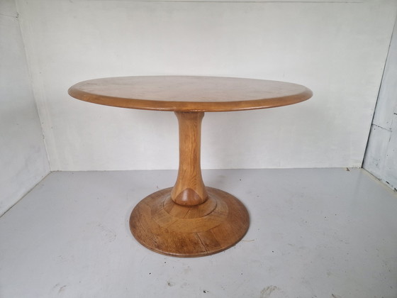 Mesa de comedor de madera maciza con base vintage de tulipán. 113 cm de diámetro y 76 cm de alto. Un modelo precioso y robusto. Presenta algunos arañazos en el tablero, pero en general está en buen estado y cuenta con una base preciosa y robusta. El tablero se puede desmontar para su transporte.