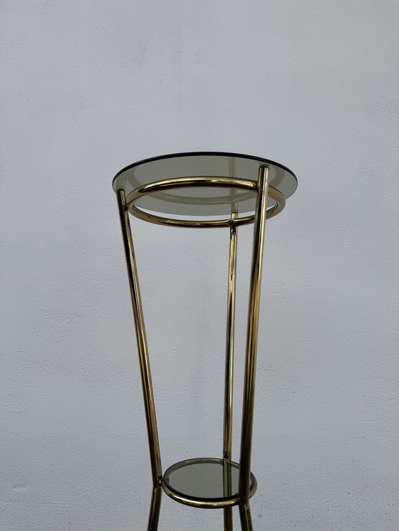 Encantador macetero trípode (soporte, columna, etc.) de metal dorado con tres estantes circulares de cristal ahumado de la década de 1970; muy buen estado general (algunas pequeñas picaduras en el metal).