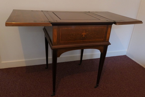 Esta clásica mesa de té de caoba irradia elegancia con sus refinadas incrustaciones y su cálido tono marrón. Perfecta para un ambiente tradicional, esta mesa ofrece estilo y funcionalidad. Sus alas abatibles la convierten en una opción versátil para cualquier interior.