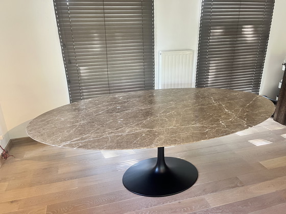 Mesa de comedor ovalada con tablero de mármol marrón mate y base de metal negro. Inspirada en la mesa Tulip de Saarinen. Estado impecable. 220 cm x 120 cm x 72 cm, cómoda para 8 personas.