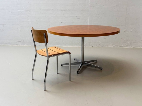 Mesa redonda de la década de 1970 con un amplio tablero de chapa de nogal en un cálido tono y una distintiva base de acero de cinco radios. La combinación de la superficie de madera y la funcional estructura cromada evoca los diseños típicos de los fabricantes europeos de muebles de oficina de la época, con líneas limpias y sobrias. Su robusta construcción y su diseño sobrio la hacen versátil, ya sea como mesa de comedor, mesa de conferencias o pieza central de un espacio de trabajo.
