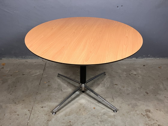 Mesa redonda con patas cromadas y pies ajustables nuevos. El tablero es de chapa de roble. Presenta ligeros arañazos y el borde presenta algunas manchas; por lo demás, se encuentra en buen estado.