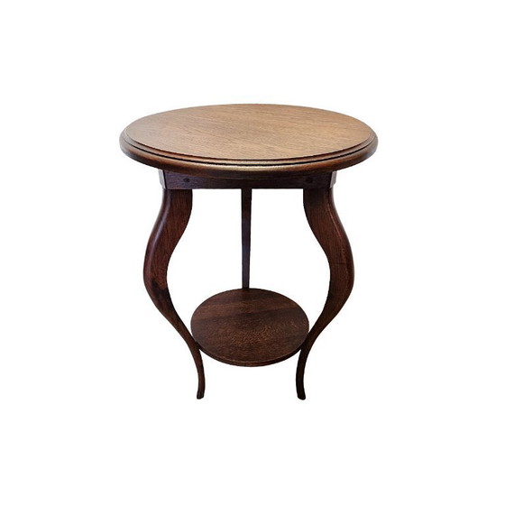 Mesa trípode francesa Art Nouveau de roble, de principios del siglo XX. Preciosa mesa Art Nouveau francesa con tablero redondo y tres patas de doble curvatura, con un estante adicional. Ideal para un recibidor, perfecta para exhibir una pieza decorativa o un gran jarrón de flores. Fabricada en madera maciza de roble con acabado en tinte oscuro, se encuentra en buen estado.
