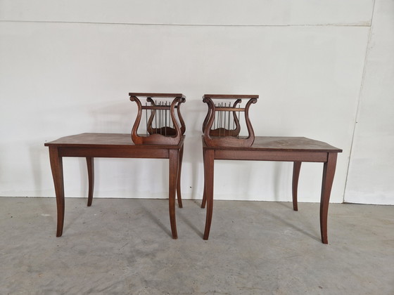 Descubra la refinada elegancia de estas mesas auxiliares Art Nouveau con forma de arpa, un maravilloso complemento para cualquier interior. Con sus elegantes líneas y sus exclusivos detalles de arpa, estas mesas aportan un toque de encanto histórico a su espacio vital.