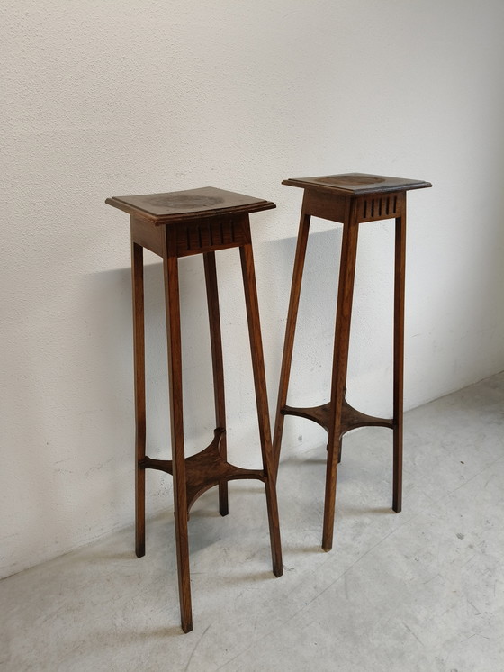 Mesas para plantas o esculturas de gran tamaño. De roble, viejas y desgastadas.
