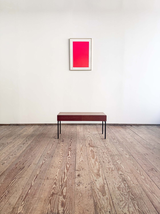 Dimensiones 86 x 37 x 43 (L x P x Al). Elegante mueble de Dieter Waeckerlin con base de metal negro. Marquetería de arce. La mesita de noche viene en chapa de teca con dos cajones. Waeckerlin fue ebanista, arquitecto de interiores y diseñador de muebles suizo. Sus muebles de mediados de siglo se caracterizan por un lenguaje de diseño purista, especialmente visible en sus famosos aparadores. Desarrolló sistemas de mobiliario con Le Corbusier y se hizo famoso por su colaboración con el fabricante Behr de Osnabrück. El mueble se presenta en un magnífico estado de conservación, con solo leves marcas de uso, algunos ligeros arañazos y algunas pequeñas marcas en las patas, sin ningún defecto.