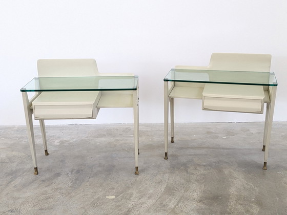 Mesilla de noche - Latón, Cristal, Madera - Pareja de mesillas de noche, de madera lacada en blanco, con tapa de cristal.