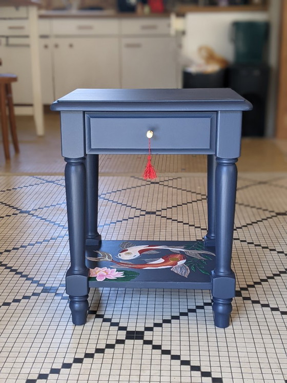 Mesita de noche antigua restaurada, acabado mate azul profundo, decoración de carpas koi pintadas a mano.