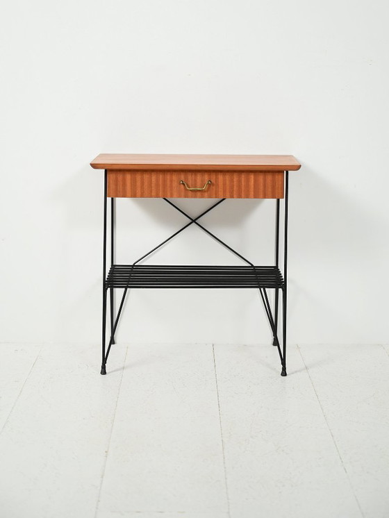 Mesita de noche vintage escandinava de caoba y hierro, modelo "Rolf", diseñada para IKEA en 1961. El cuerpo de madera, con una veta cálida y uniforme, reposa sobre una estructura de hierro negro con tirantes cruzados y un estante inferior de rejilla. El cajón presenta un tirador curvado de latón, un elegante detalle que contrasta con el rigor gráfico de la estructura metálica, reflejando el enfoque funcionalista nórdico de la década de 1960.