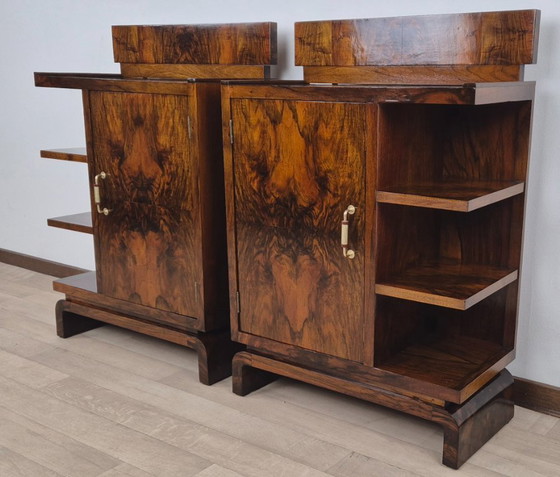 Un par de mesitas de noche Art Déco Amalfitan espectaculares, si no únicas, elaboradas completamente en madera de nogal italiano.