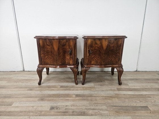 Mesitas de noche estilo Chippendale de la década de 1950, distintivas por sus líneas ligeramente onduladas y las tallas que decoran las patas y el marco.
