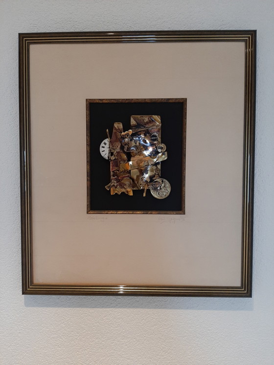 Obra de arte de 1995 del metalúrgico alemán Günter Herpers. Esta pieza única está hecha principalmente con piezas de relojes de bolsillo antiguos. Véase la nota del artista en la parte posterior: «Técnicamente, la creé con varias piezas de relojes de bolsillo antiguos, collage de metal fresco HE95». Además, en el reverso de la montura: «HE95 completo, de fabricación propia». Herpers también incorporó un pequeño rubí a esta obra. Véase las fotos. Las dimensiones del marco de madera de la obra son: alto 53,5 cm y ancho 47,5 cm.