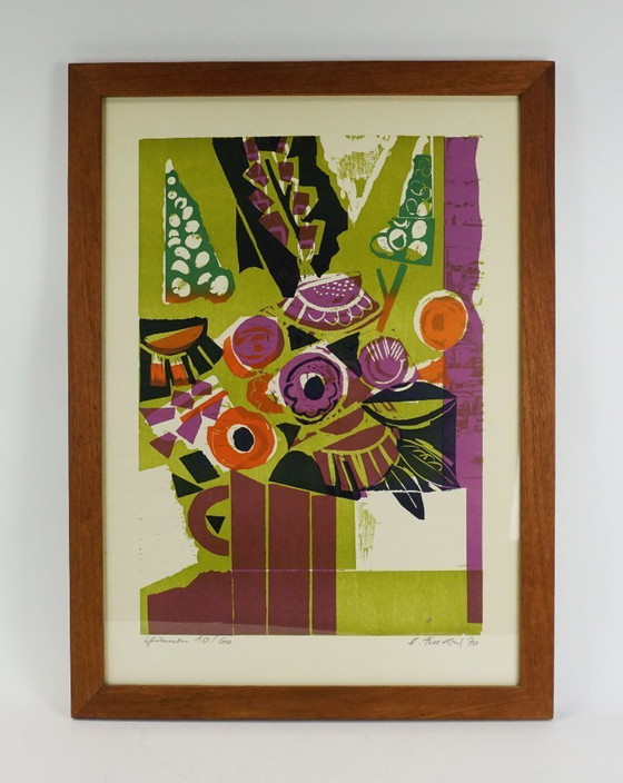 Color woodcut 'Flowers' by the painter and wood engraver Heinz Friedrich (1924-2018), Schwetzingen, Germany. No. 10/60. Signed H. Friedrich 70. Framed with a teak wood frame.