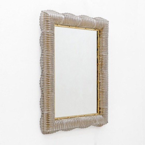 The frame is composed of Murano glass elements embossed with a striped and wavy texture, creating a striking interplay of light and depth. The slightly smoked glass lends warmth and refinement to the overall effect, while the modular construction of the frame creates a soft, sinuous, almost sculptural profile.