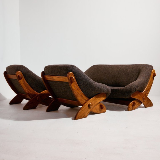 Cómodo conjunto de sofá tapizado de la década de 1970. El conjunto consta de un sofá de tres plazas y dos sillones. La tapicería está en muy buen estado, pero presenta algunos arañazos, manchas y desgaste en la estructura de haya. Dimensiones: Sofá de tres plazas: 200 x 85 x 90 cm, Ancho: 42 cm /// Sillón: 100 x 85 x 90 cm, Ancho: 42 cm