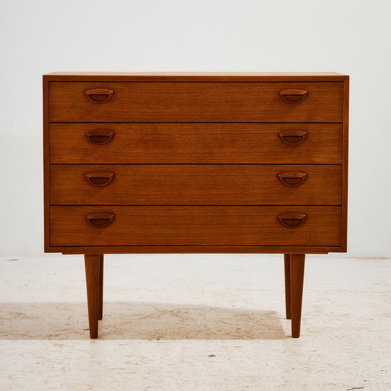 Cómoda de cuatro cajones diseñada por Kai Kristiansen para Feldballes Møbler en la década de 1960. El mueble está equipado con emocionantes tiradores basados en la marca del diseñador. La superficie de la cómoda ha sido completamente restaurada.