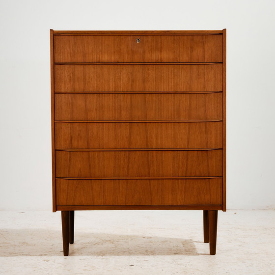 Cómoda danesa restaurada de teca con seis cajones de los años 60. Emocionantes tonos de teca, detalles limpios y prácticos cajones. Falta la llave del cajón.