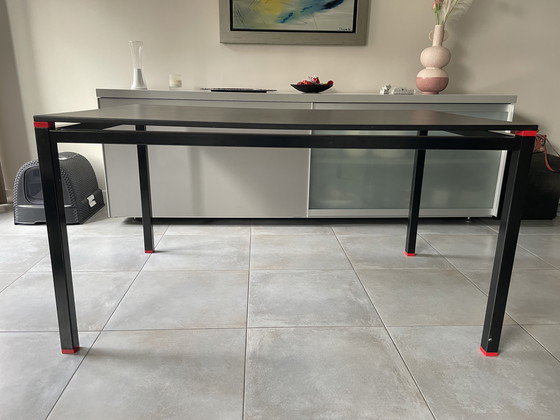 Esta moderna mesa de comedor ofrece un diseño elegante y contemporáneo, perfecto para cualquier comedor con estilo. Su minimalista acabado negro se complementa con sutiles detalles en rojo, aportando un toque de sofisticación a su espacio.