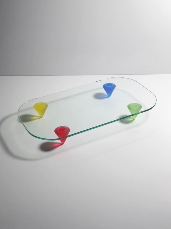 Sehr schöne längliche Platte von Montana im Postmodernen Stil. Die Schale ist aus Glas und steht auf kleinen Beinen, die in unterschiedlichen Farben und Grundformen gehalten sind. Typischer Memphis Stil um 1980/1990.
