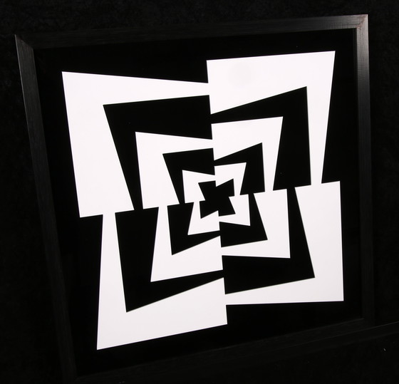Composición 648B Construcción 3D a modo de relieve realizada en vidrio acrílico coloreado, enmarcada en marco de madera Año: 2018 Firmado y numerado a mano en la etiqueta Edición: 35 Estado: En buen estado Hoja: 60,0 × 60,0 cm Nota: La numeración difiere de la numeración que se muestra en el certificado.